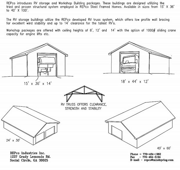 You choose the size, ceiling height, roof pitch and location of wall openings for your custom garage or utility building and REPco will design/ engineer the building kit and ship it to your site.